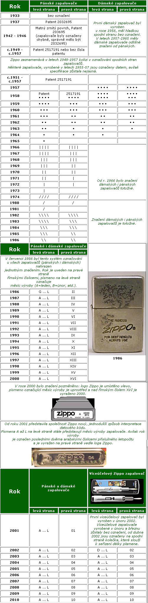 Od roku 1958 má každý zapalovač Zippo zespoda vyražené dva symboly, které udávají rok a měsíc jeho výroby. Následující tabulka ukazuje jednotlivé symboly v odpovídajících letech. Od roku 1986 písmeno vlevo odpovídá měsíci výroby (A - leden, B - únor atd.).